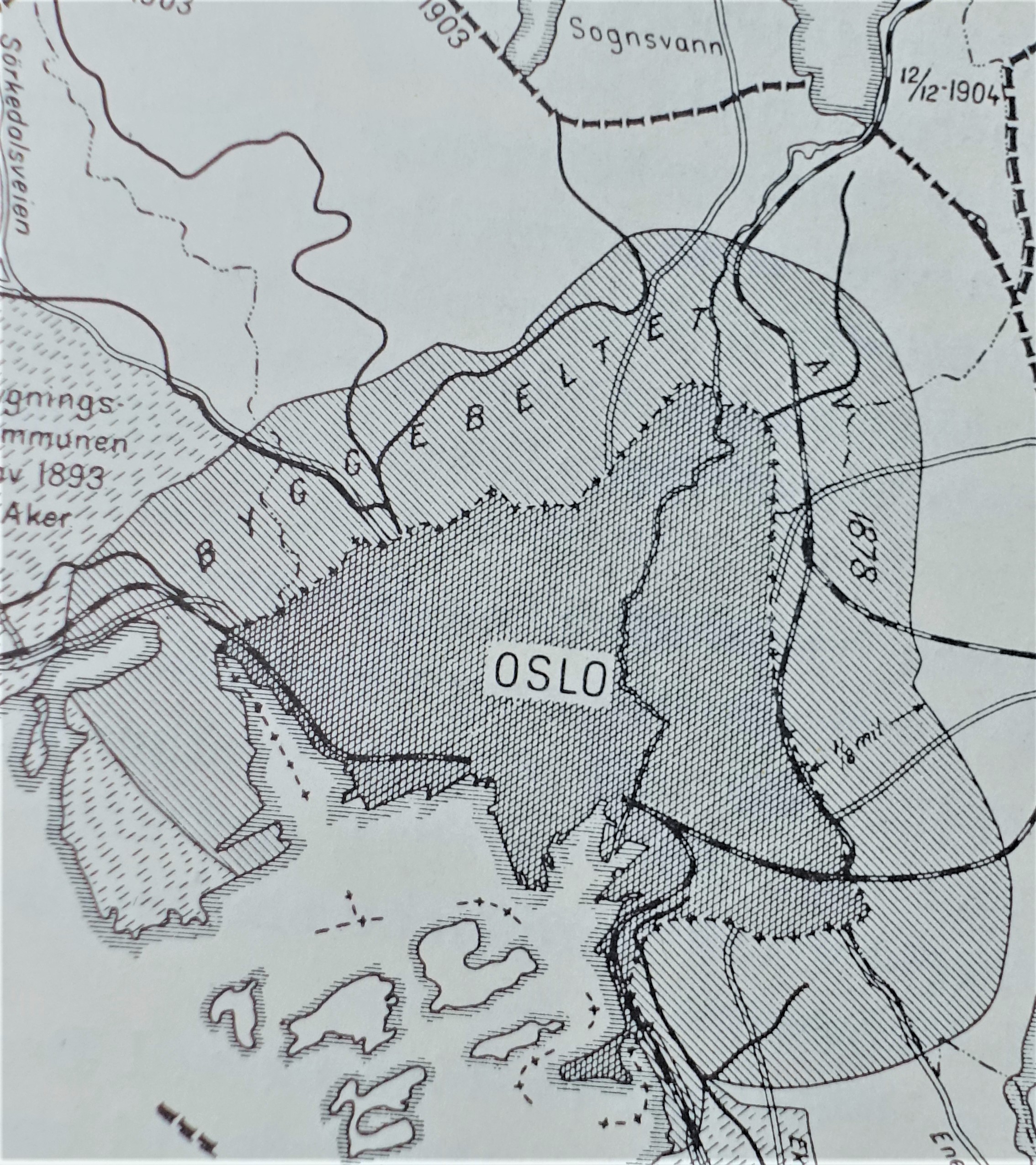 (Byggebeltet i Aker. Fra Aker 1837–1937 : kommunens styre og forvaltning gjennem hundre år. Aker kommune, 1940, side 247.)