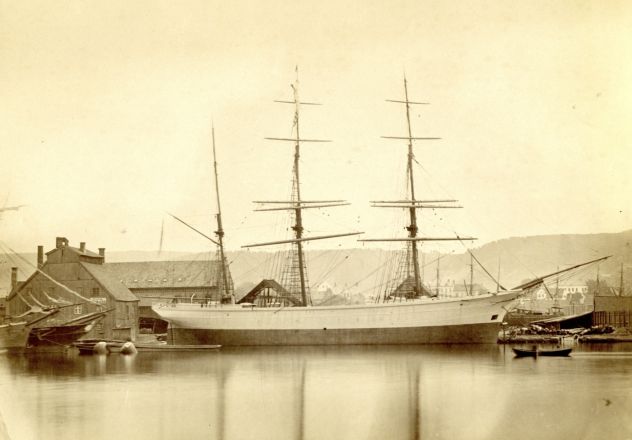 Bark Broderfolket bygget som det siste skip ved Brinchs kran i 1878. Senere kjøpt av Kristianiarederen Fred. Olsen, solgt i 1909 som rederiets siste seilskute. Foto: Norsk Maritimt Museum
