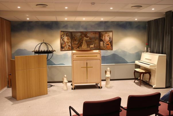 Ammerudlunden sykehjems seremonirom med den tredelte altertavlen i åpen posisjon. Foto 2025 Sylvi Baardseth Panjwani / Oslo Byleksikon