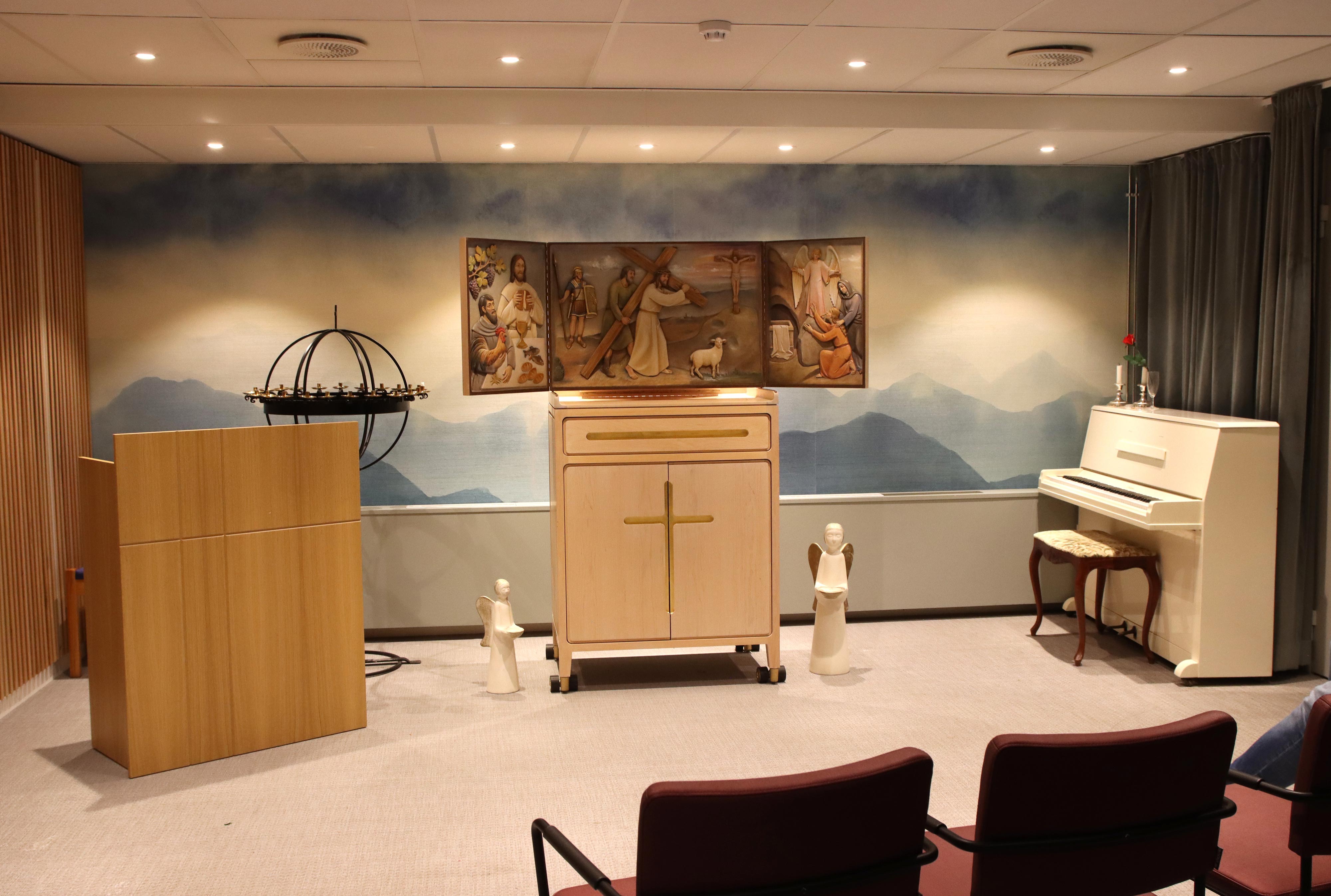 Ammerudlunden sykehjems seremonirom sett med altertavlen i åpen posisjon.