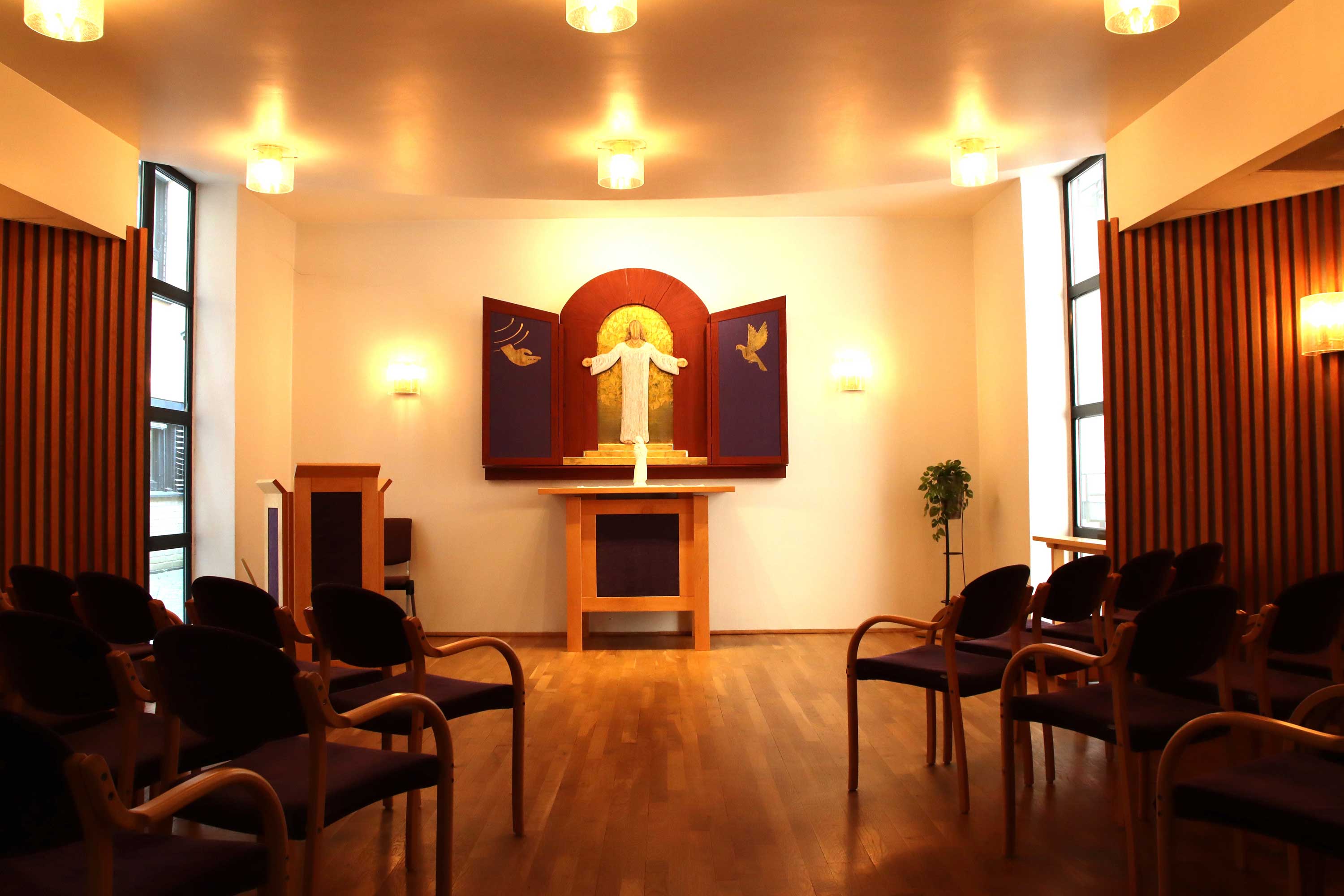 Kantarellenhjemmets kapell sett mot alteret med åpent alterskap. Foto 2025