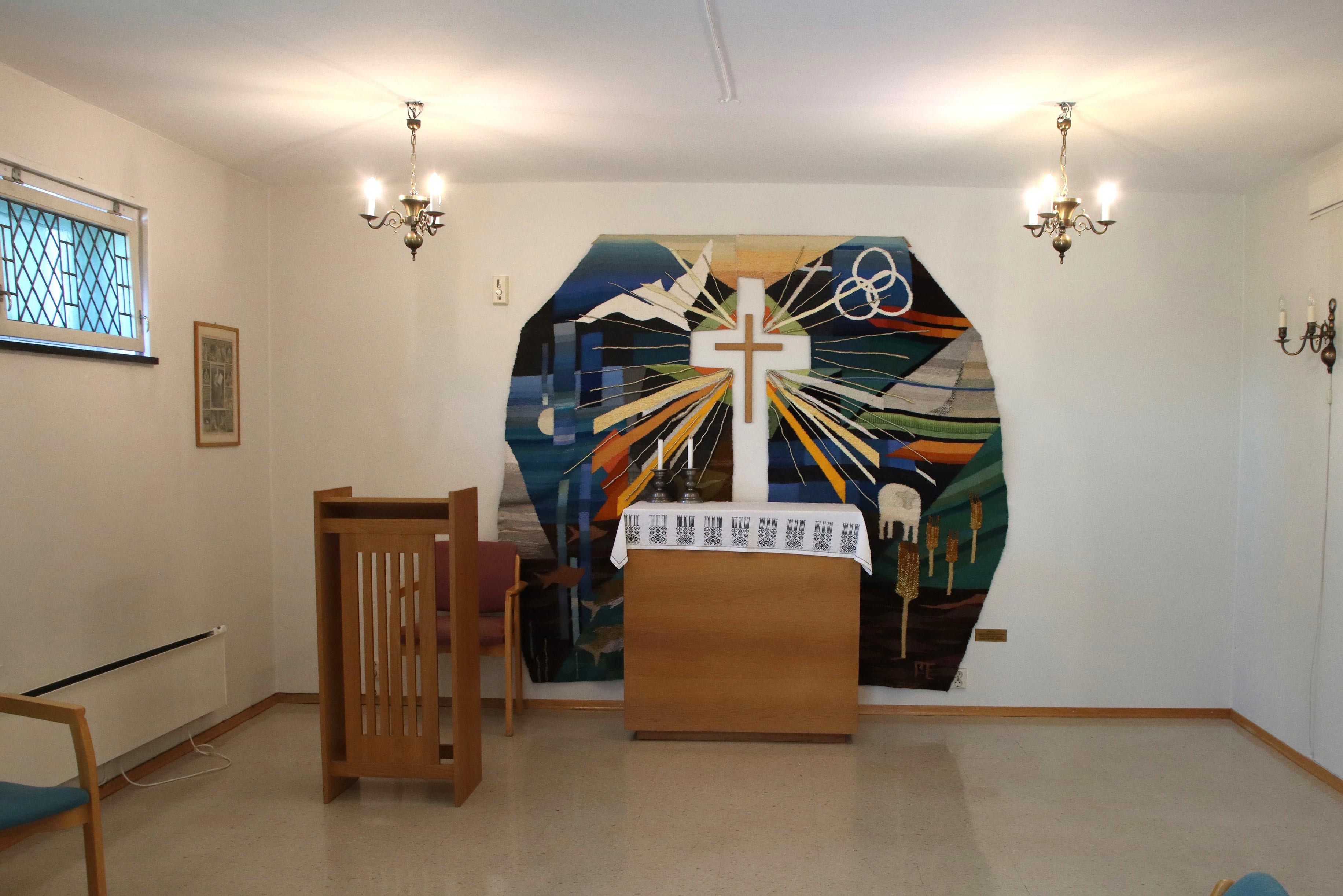 Rødtvet sykehjems kapell mot alteret med billedteppe av Maren Erland.