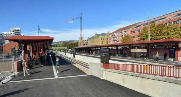 Majorstuen stasjon etter ombygging, september 2025, perrong mot sentrum til venstre. Foto: Helge Høifødt / Oslo byleksikon