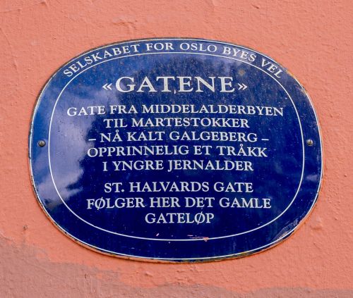23. En treetasjes frittliggende bygård. Et av Oslo Byes Vels blå skilt er satt opp her til minne om «Gatene» i middelalderens Oslo, veien ut fra byen opp til Martestokker, dagens Galgeberg.