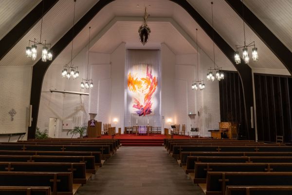 Kontorfløy, møterom i kjeller og egen fløy med møterom (kirkestue). Billedvev av Randi Ingeborg Garnes og av Grete Lein Lange i kirkestuen.