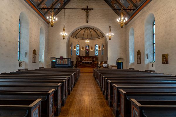 Alterbildet er utført av Hugo Lous Mohr. Det består av fem felter og forestiller Jesu fødsel, dåp, lysbringeren, korsfestelsen og oppstandelsen. Altertavlen har mange fremstillinger av engler, noe som har gitt kirken tilnavnet Englekirken. På altertavlen står fire forgylte statuer av evangelistene, utført av Arthur Gustavson. I 1954 fikk man som gave et glassmaleri, som fremstiller Kristi gjenkomst og som er utført av Per Vigeland. Kirketekstiler av Randi Veiteberg Kvellestad (2009 og 2016).