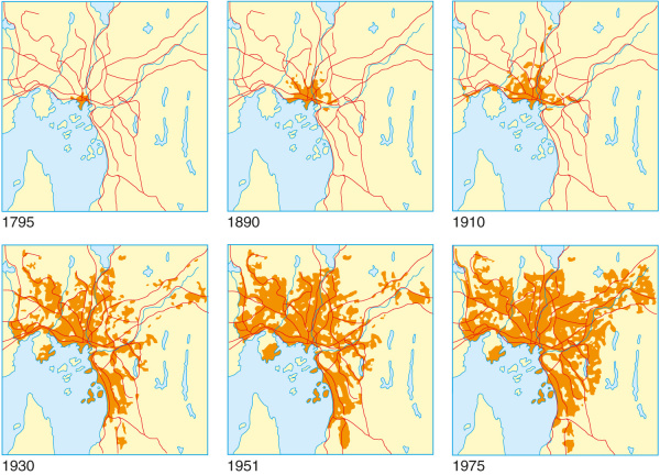 Fra tiden omkring den første verdenskrig startet det også en ikke ubetydelig byvekst utenfor den administrative byen. Tidligere hadde mangelfulle kommunikasjoner vanskeliggjort enn slik utbygging. Spredningen av byveksten har ført til et stadig større avvik mellom den administrative byens, tettstedets (den fysisk sammenhengende bymessige bebyggelsen) og den funksjonelle byens («byregionens») folketall.