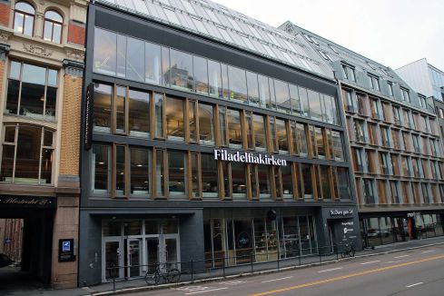 Filadelfiakirken Oslo Sentrum, St. Olavs gate 24, pinsemenighet og forsamlingslokale i en moderne bygård. Storsalen innviet 28. august 1938 ligger nå i et nytt kontorbygg på 2.500 m² oppført 2013 (ark. MAP arkitekter AS). Tidligere lå det her en funkisgård midt i den eksisterende kvartalsstrukturen oppført 1938 (ark. Ahasverus Vejre). Over inngangspartiet stod navnet Filadelfia med store bokstaver. Det gamle bygget mot gaten ble revet i forbindelse med oppføring av det nye, mens den store møtesalen ble beholdt. Denne salen har ca. 1200 plasser, ikke utsmykninger eller dekorasjoner utover et enkelt kors og ordet Jesus med store, blanke bokstaver, men en stor kuppel av akustiske hensyn. Foran i salen er talerstol og dåpsbasseng