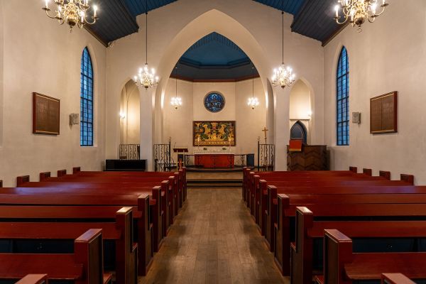 Bygningen inneholder også dåpssakristi og prestekontor.