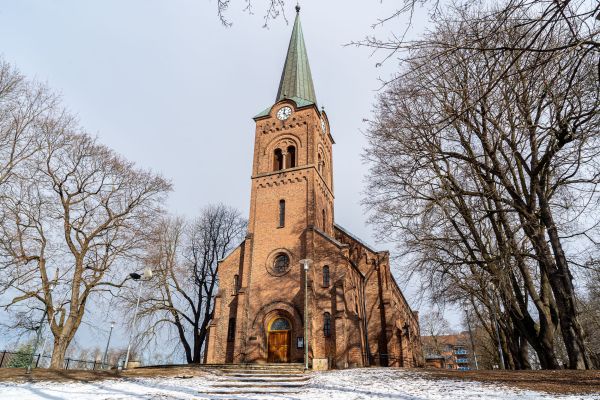Kirken er treskipet og oppført i nyromansk stil av rød tegl etter tegninger av arkitekt Jacob Wilhelm Nordan. Opprinnelig hadde den 1000 sitteplasser, men senere er benkene flyttet ut fra langveggene og tallet på sitteplasser er blitt redusert til ca. 400. Altertavlen ble bestilt av menigheten og bekostet av frivillige gaver, er malt av Otto Sinding (1879) og fremstiller Kristus på korset. For øvrig er kirken rikt utstyrt med glassmalerier, en gave fra Freia. I koret er det to store glassmalerier, hvorav det ene har Jesu fødsel som hovedmotiv og det andre Jesu oppstandelse. De ble utført 1916. Også i de små korvinduene ble det satt inn glassmalerier. I 1920 ble det plassert seks glassmalerier i vindusrekken mot sør. Alle disse maleriene har motiver fra apostelen Peters liv og ble utført av Enevold Thømt. I 1951 ble det satt inn et nytt glassmaleri over hovedinngangen, utført av Maria Vigeland.